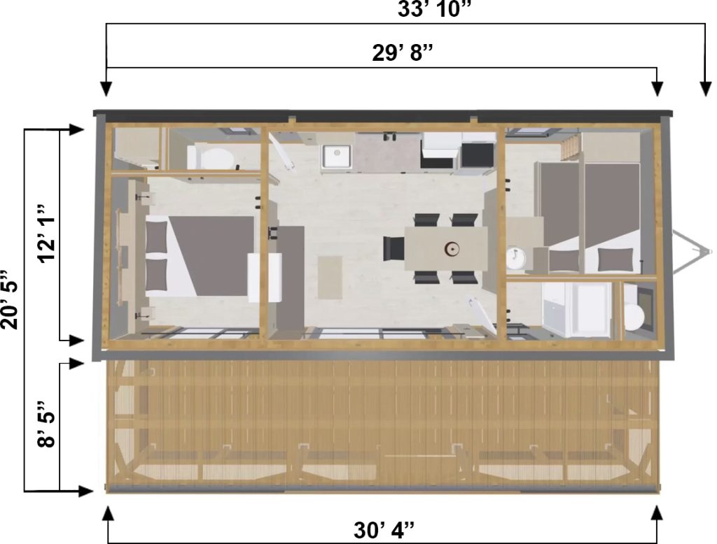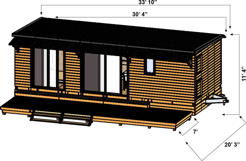 Enjoy 572 square feet of Glamping experience with a fully-equipped kitchen and dining area, a bathroom with shower, two bedrooms that and expanded outdoor porch.